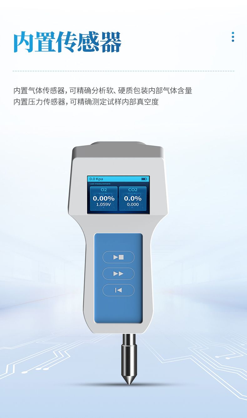 3.內置氣體傳感器,可精確分析軟、硬質包裝內部氣體含量;