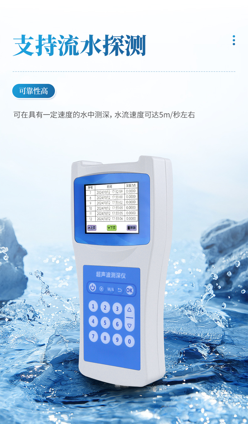 超聲波測深儀是測量水庫、湖泊、江河、淺海等水體的便攜式測深儀,測深時將超聲波換能器置于水面或一定位置,利用超聲波在水中的固定聲速VC和超聲波發射到接收的時間T,儀器自動換算出水深H。本品是我司積多年生產經驗,吸取了多種同類產品優點,而開發的一款方便適用的手持式超聲波測距儀表。超聲波收發轉換電路采用專用大規模集成電路,元件貼片率99%,并以液晶顯示測深結果,保證了產品的長期可靠性,同時將其功耗降到了極低。具有測量精確、耗電省、可靠性高、使用方便、操作簡單、測量速度準確、攜帶方便等優點。儀器可在靜水中測深,也可在具有一定速度的水中測深;水流速度可達5m/秒左右,是水文測驗、水電廠庫區、湖泊、河道勘測和環境水域監測的理想水深測量儀器。