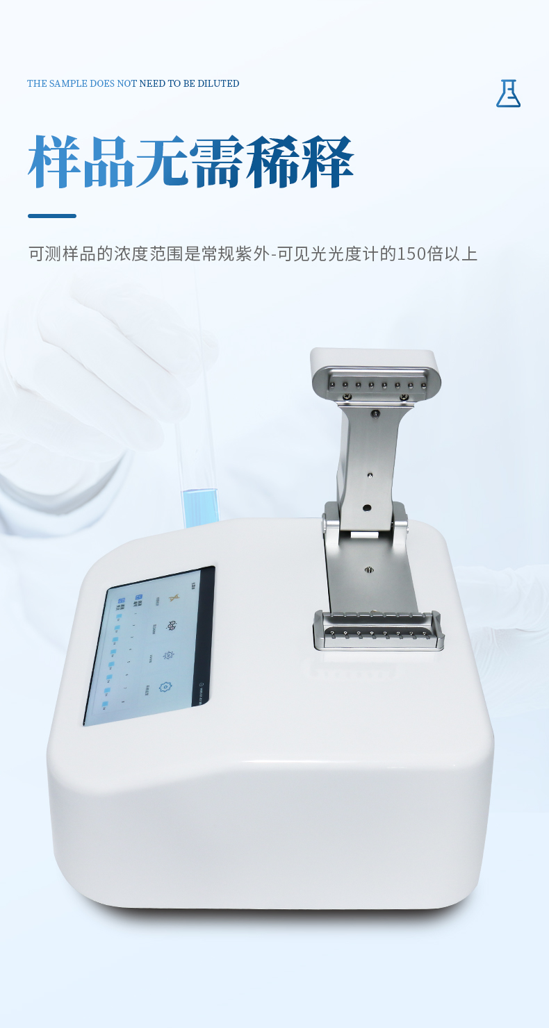 ●樣品濃度:樣品無需稀釋,可測樣品的濃度范圍是常規紫外-可見光光度計的150倍以上;