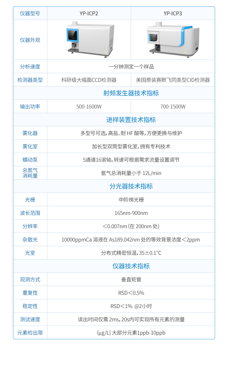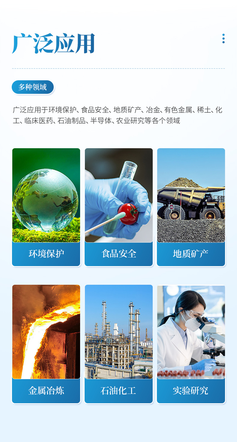 全譜直讀型電感耦合等離子體發射光譜儀 ,是目前無機元素分析的主流產品,它具有光譜干擾小,穩定性好、分析快速等優點,是無機元素分析領域常用的手段。可廣泛應用于環境保護、食品安全、地質礦產、冶金、有色金屬、稀土、化工、臨床醫藥、石油制品、半導體、農業研究等各個領域。用于測定不同物質中的常量、微量、痕量元素含量,可用于樣品中元素的定性、半定量及精確定量分析,檢出限可達十億分之一級。