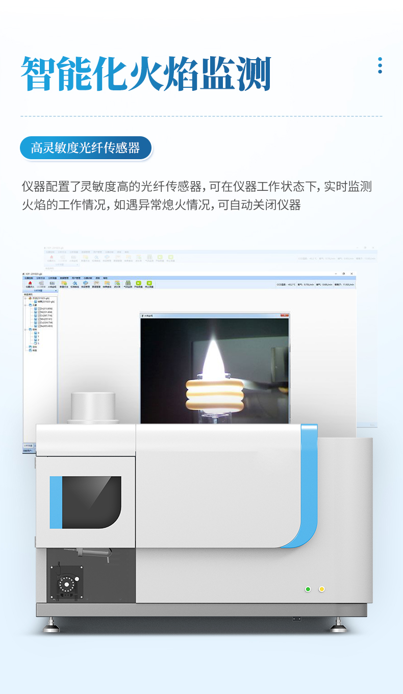 儀器配置了靈敏度高的光纖傳感器,可在儀器工作狀態下,實時監測火焰的工作情況,如遇異常熄火情況,可自動關閉儀器。