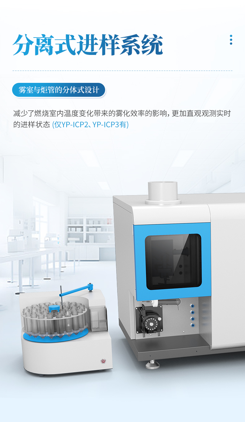 霧室與炬管的分體式設計,較少了燃燒室內溫度變化帶來的霧化效率的影響,更加直觀的觀測實時的進樣狀態。配合專利技術的加長型霧室,有效進行氣液分離,較少水蒸氣的干擾。