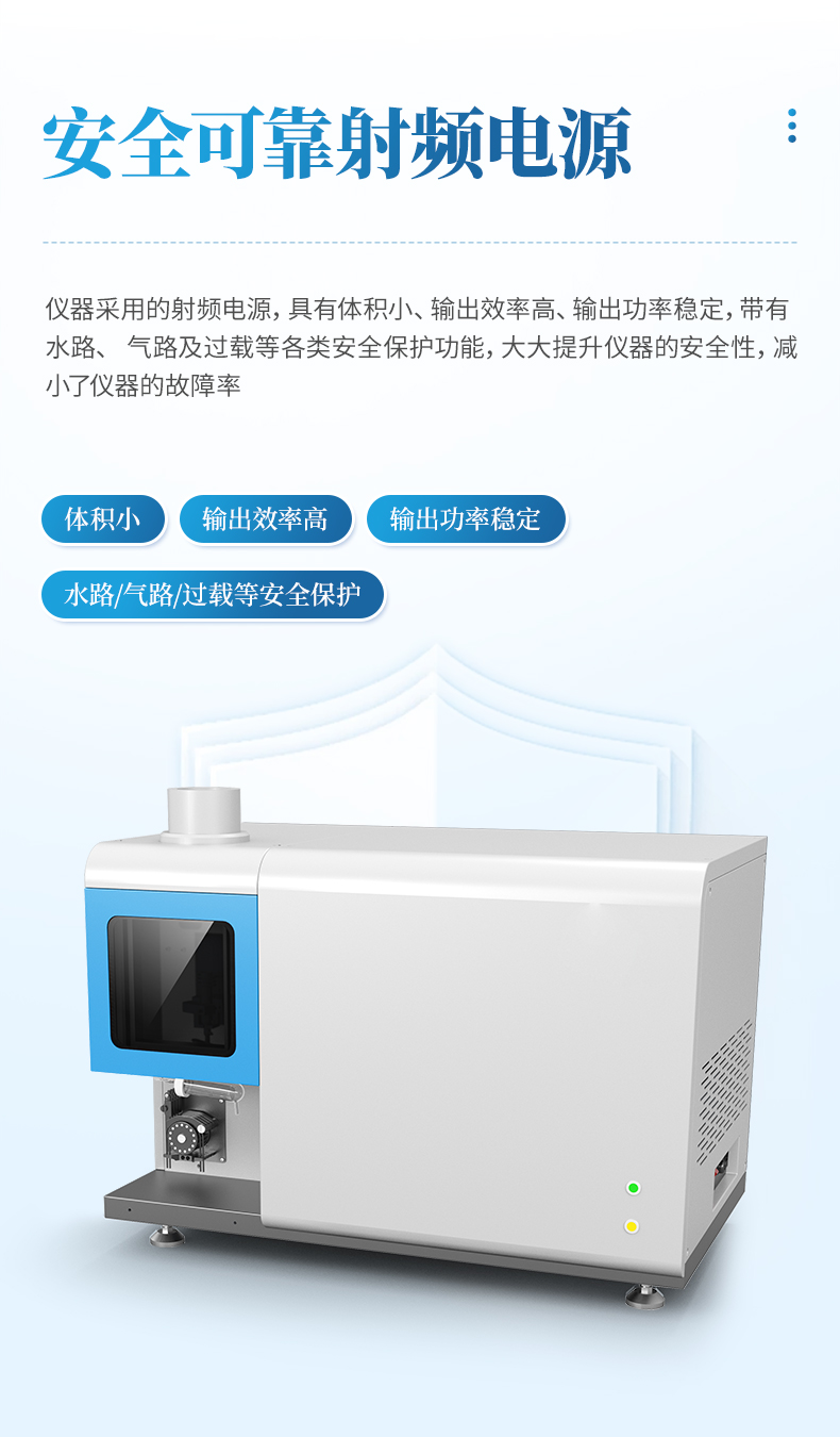 儀器采用的射頻電源,具有體積小、輸出效率高、輸出功率穩定,帶有水路、氣路及過載等各類安全保護功能,大大提升儀器的安全性,減小了儀器的故障率。