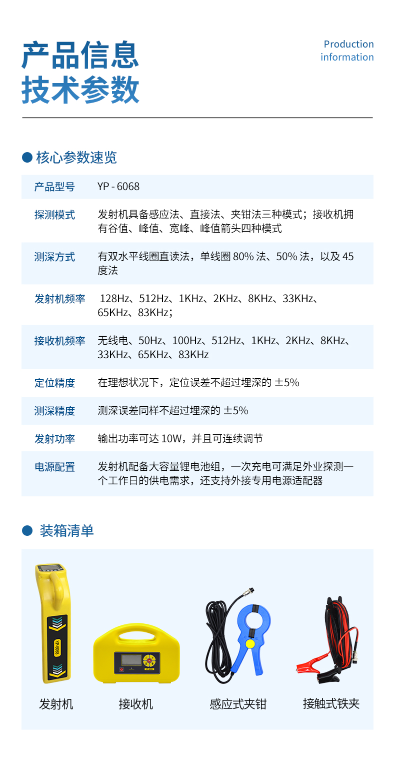 接收機頻率:無線電、50Hz、100Hz、512Hz、1KHz、2KHz、8KHz、33KHz、65KHz、83KHz(型號不同,頻率稍有差異,具體以產品規格書為準)。