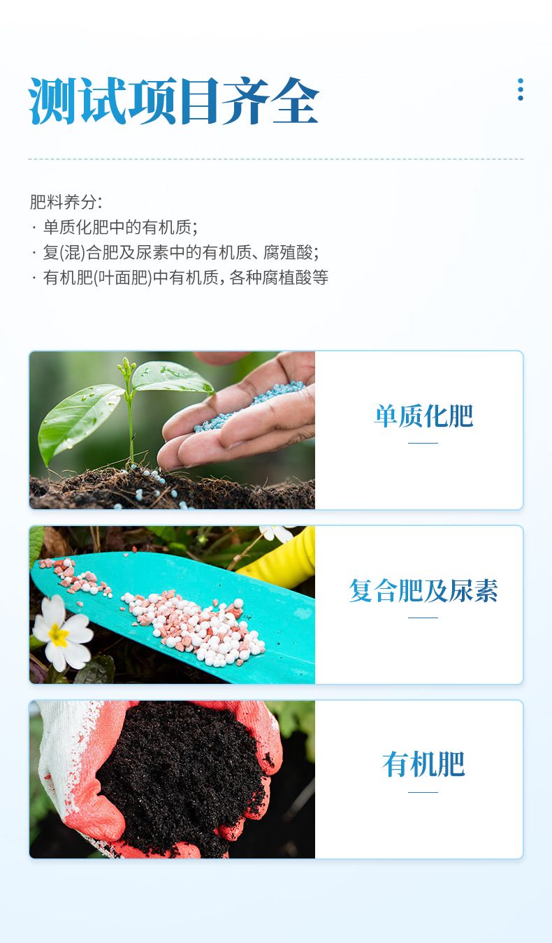 1、可檢測化肥、有機(jī)肥(含葉面肥、水溶肥、噴施肥等)、植株中的有機(jī)質(zhì)、腐殖酸等。