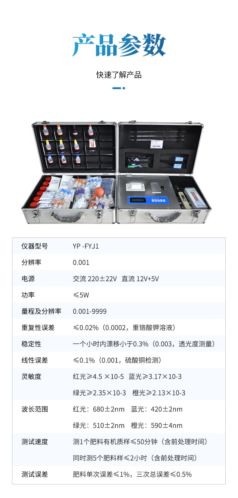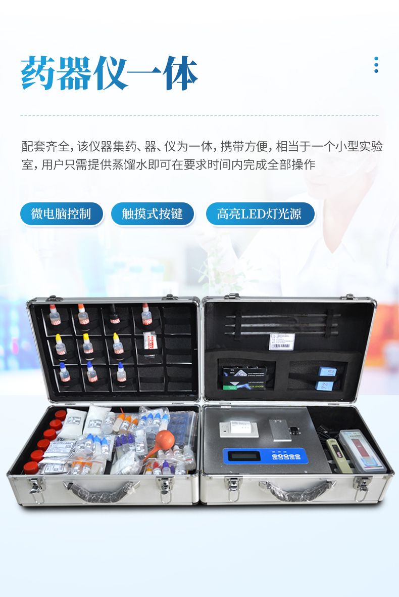 配套齊全,該儀器集藥、器、儀為一體,攜帶方便,相當(dāng)于一個小型實驗室,用戶只需提供蒸餾水即可在要求時間內(nèi)完成全部操作。適于農(nóng)業(yè)服務(wù)部門或農(nóng)資經(jīng)銷商鑒別肥料真假、肥料廠商肥料生產(chǎn)中控、農(nóng)資質(zhì)檢部門進(jìn)行農(nóng)資打假,規(guī)范農(nóng)資市場。