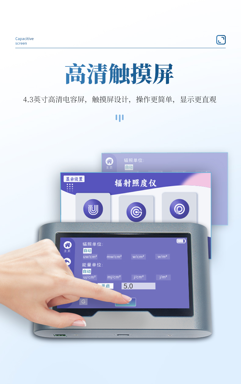 觸摸屏輻射照度計采用高清全觸摸屏設計,操作更簡單;即使是弱光也能快速
