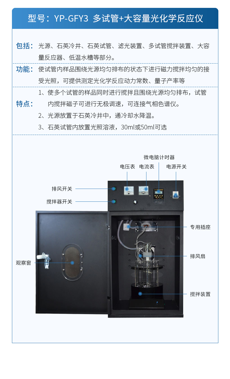 1.多試管光化學反應儀智能微電腦控制,可觀察電流和電壓實時變化