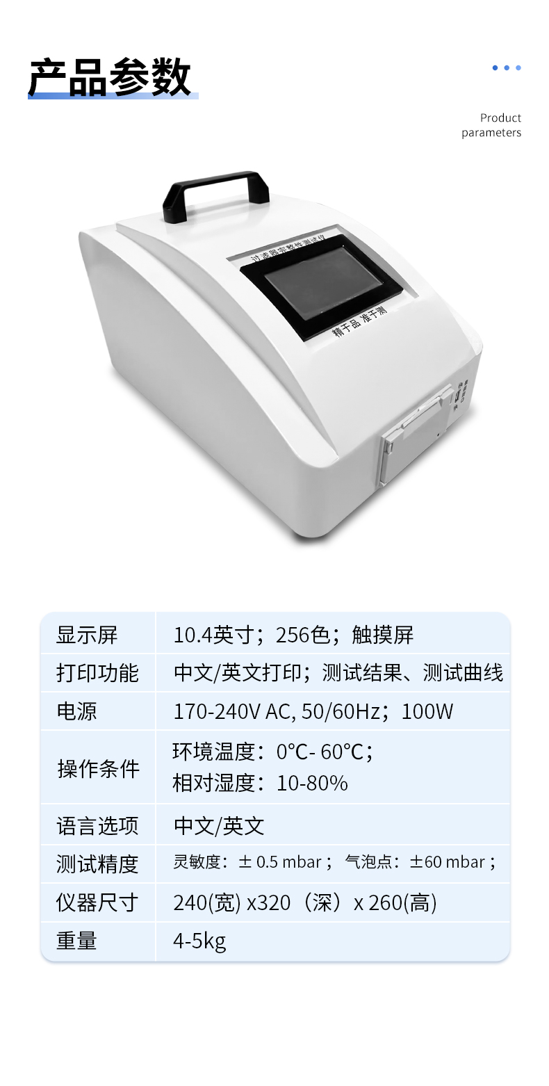 測試耗時 | 基本泡點測試:2 min±2min;擴散流測試7±2min; 水浸入流量測試7±2min;系統(tǒng)氣密性:3±1min; |