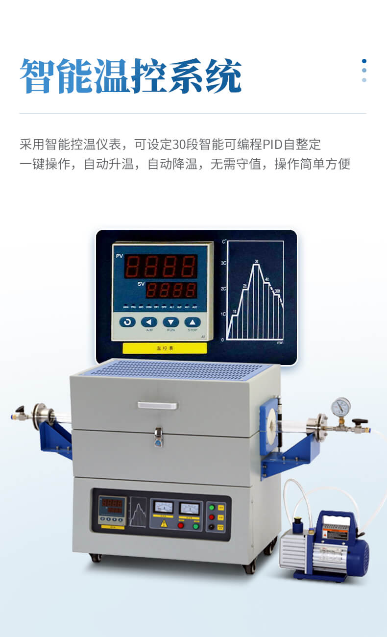 | 溫度控制 | 采用國內宇電儀表廠家的智能控溫儀表,可設定 30段智能可編程PID自整定,一鍵操作, 自動升溫, 自動降溫,無需守值,操作簡單方 便。 |