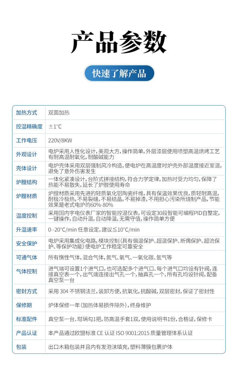 | 標準配件 | 真空泵一臺、坩堝勾 1 把,防高溫手套 1 雙,使用說明書 1 份,合 格證,保修卡。 |
