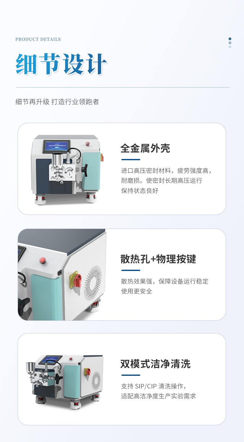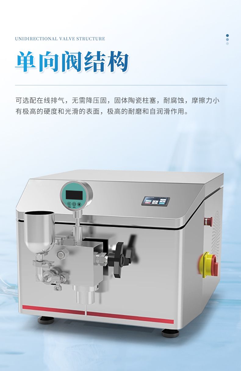 6、物料控溫:要求均質(zhì)閥帶控溫夾套與控溫介質(zhì)出入接頭、連接管路,可實現(xiàn)在線控溫,出料溫度控制在 -5℃~100 ℃ (根據(jù)物料要求不同而定);實現(xiàn)高壓均質(zhì)部件恒溫控制,實現(xiàn)設(shè)備與物料同時控溫。保證物料生物學(xué)活性。