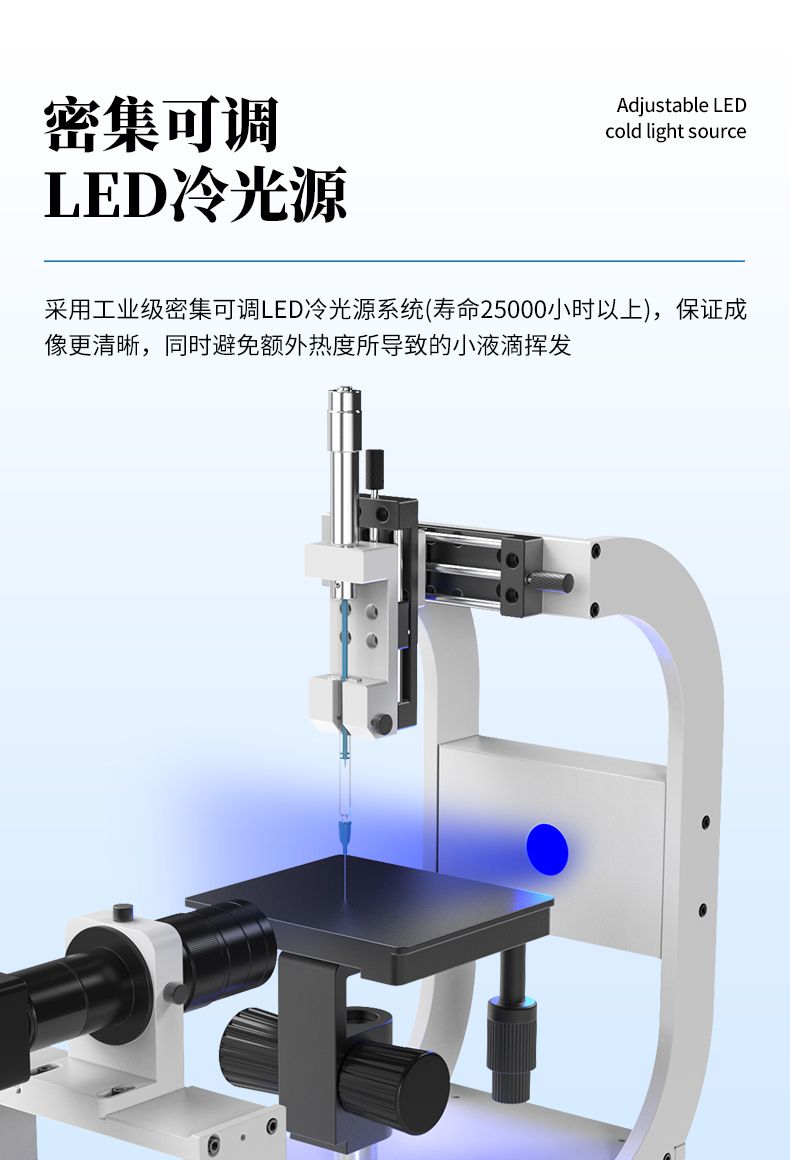 2. 采用工業級密集可調LED冷光源系統(壽命25000H以上),保證成像更清晰,同時避免額外熱度所導致的小液滴揮發;