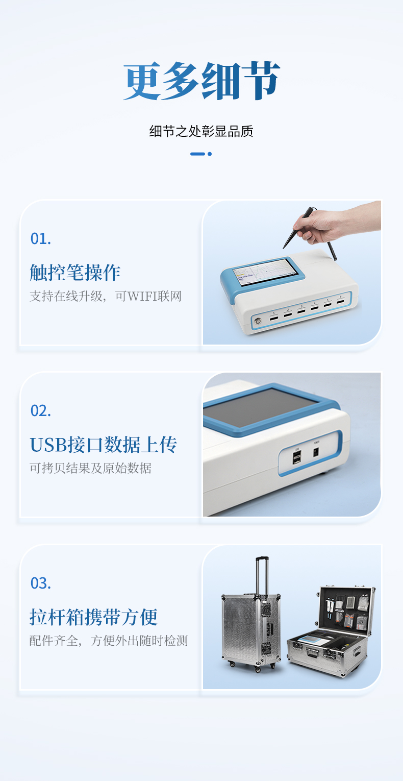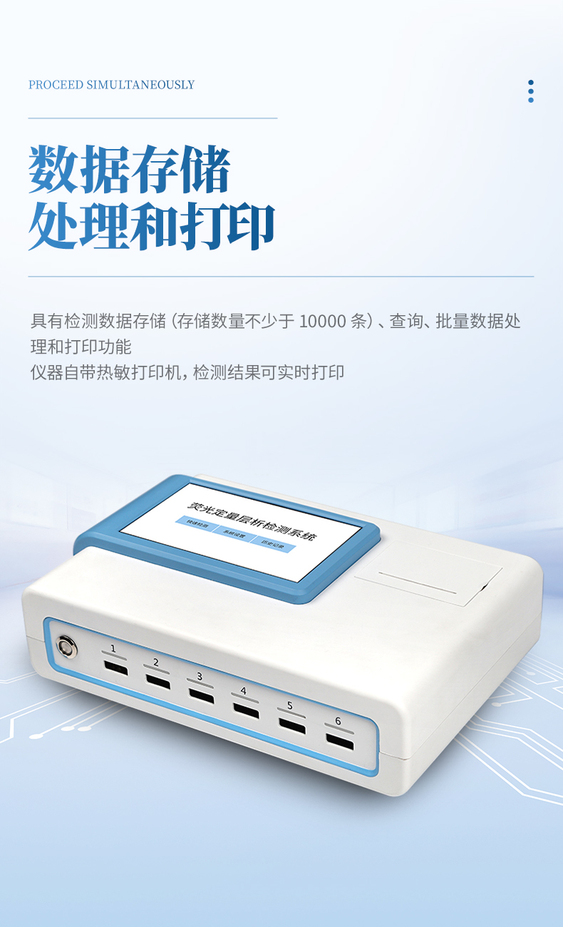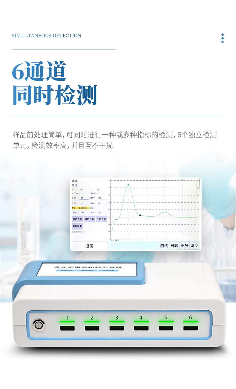 5、6通道設計,可同時進行一種或多種指標的檢測,6個獨立檢測單元,檢測效率高,并且互不干擾;
