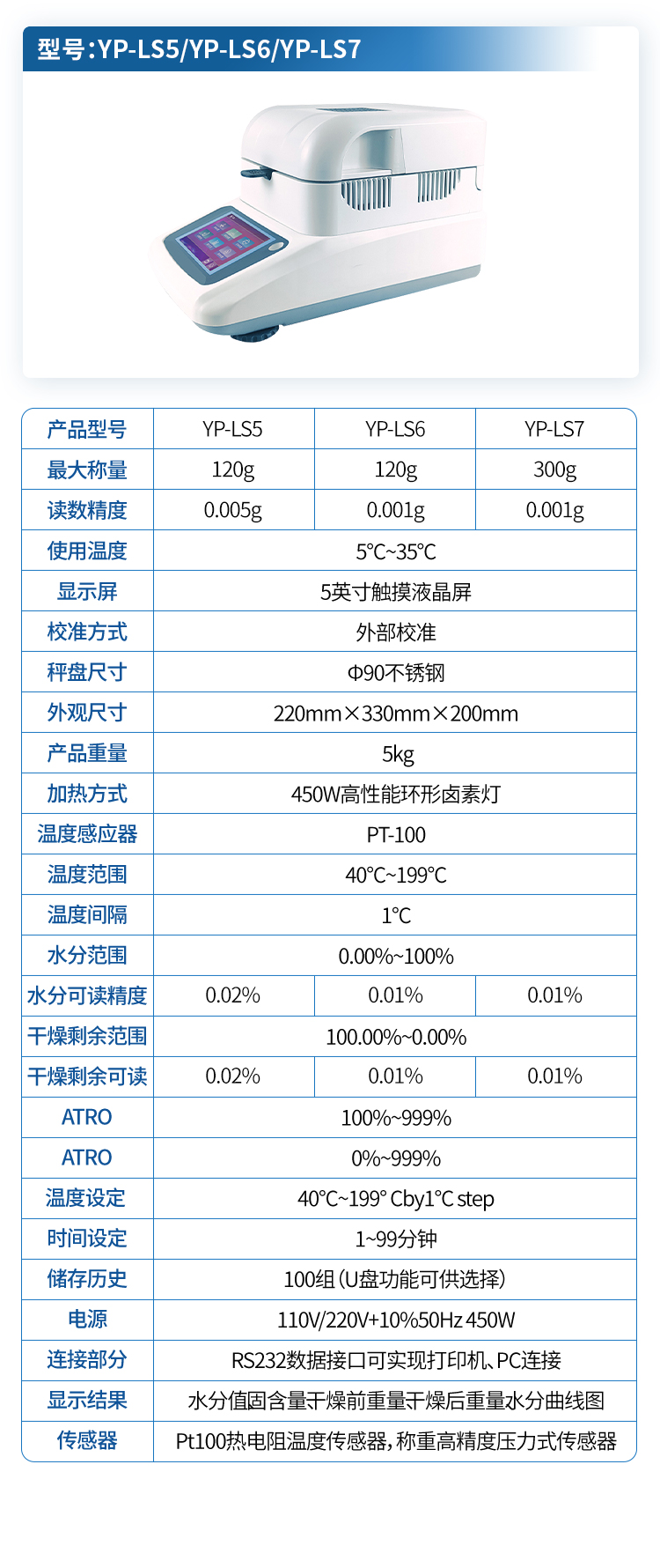 | 顯示結果 | 水分值、固含量、干燥前重量、干燥后重量、水分曲線圖 |