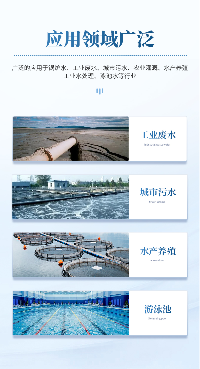 適用于純凈水廠、自來水廠、生活污水處理廠、工業污水、水產養殖、河流監測、游泳場館、水源保護、生產監測、科研實驗等。