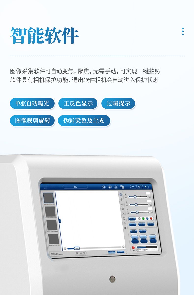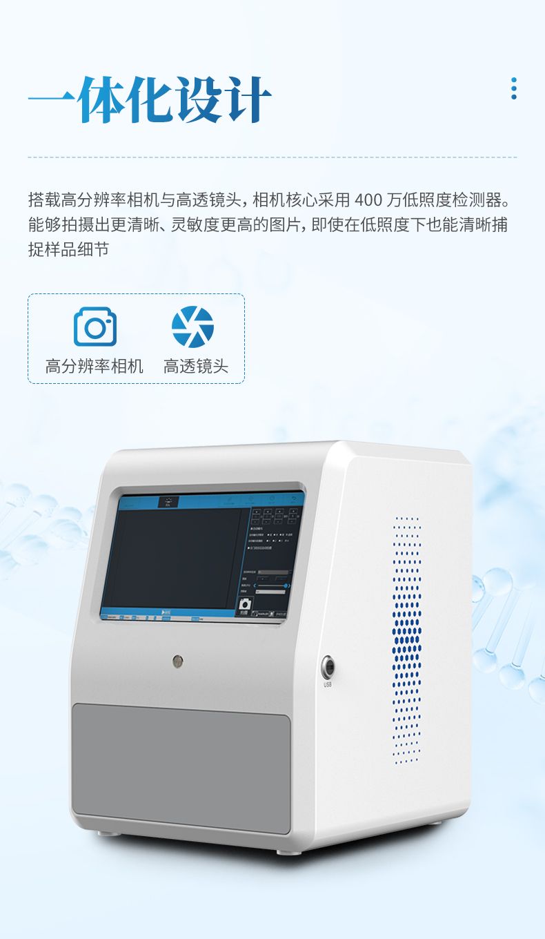 采用 13.3 寸觸摸屏控制,內(nèi)存 16G,256G 固態(tài)硬盤,使儀器具有更強(qiáng)大圖像計(jì)算及 處理能力,配合圖像采集軟件操作簡(jiǎn)捷直觀,軟件具有自動(dòng)采集信號(hào),并進(jìn)行自己處理合 成功能;曝光模式分為自動(dòng)曝光、手動(dòng)曝光、以及自動(dòng)定義曝光功能。配合圖像分析軟件 可對(duì)圖像信號(hào)進(jìn)行定性定量分析。