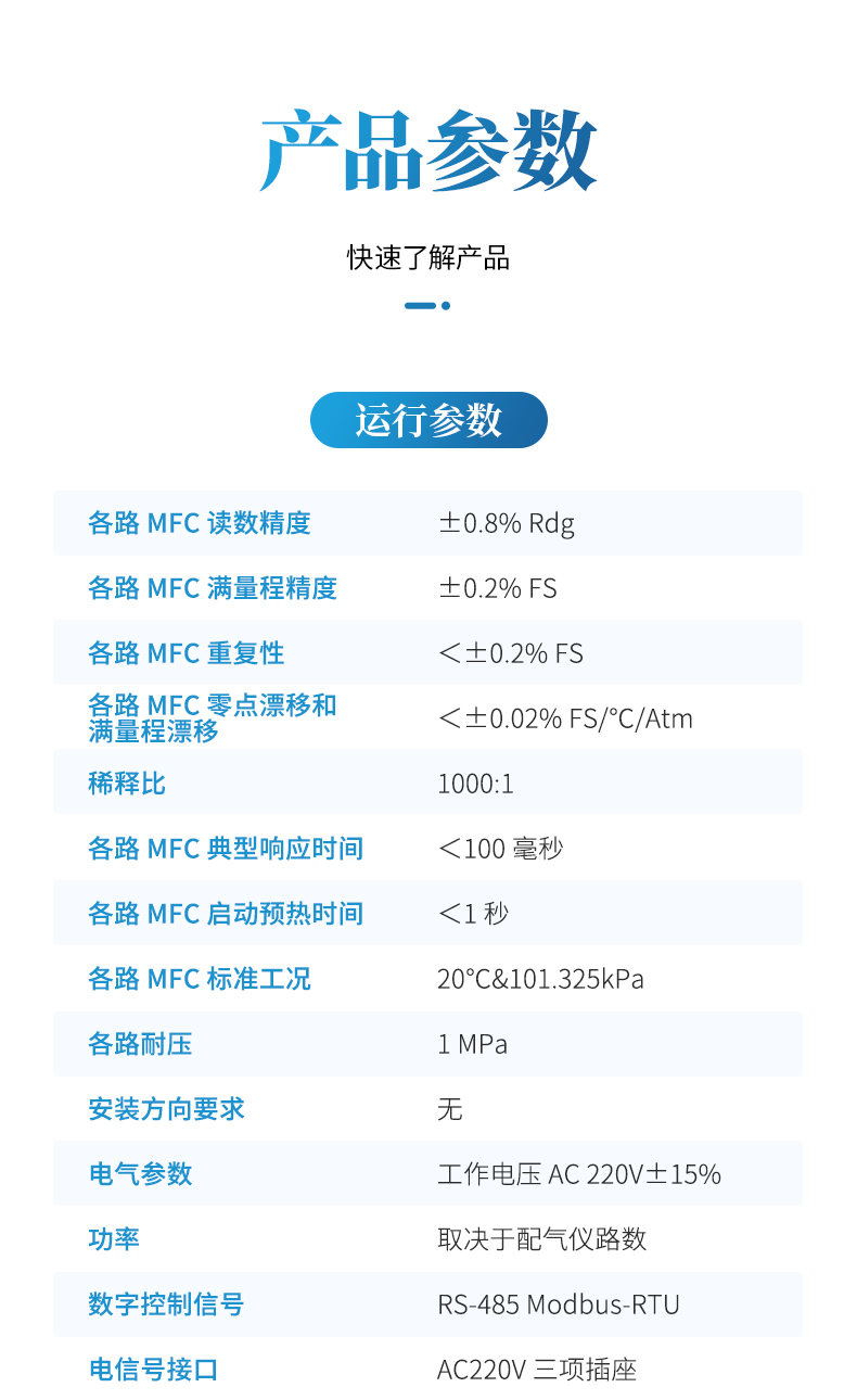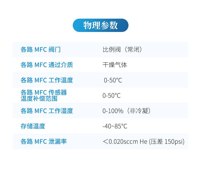 各路 MFC 零點(diǎn)漂移和滿量程漂移 <±0.02% FS/℃/Atm
