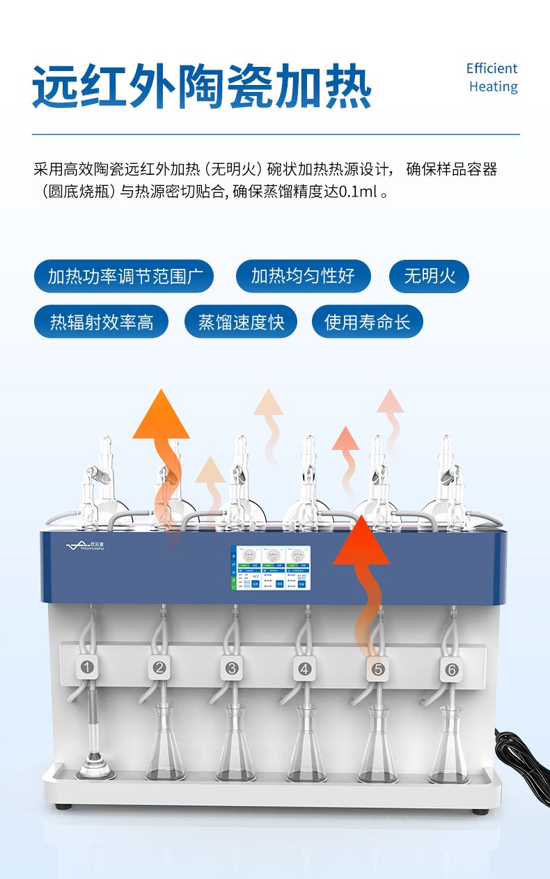 4.精準(zhǔn)控制:采用高效陶瓷遠(yuǎn)紅外加熱,具備時(shí)間與重量雙重終點(diǎn)控制,確保蒸餾精度達(dá)0.1ml。
