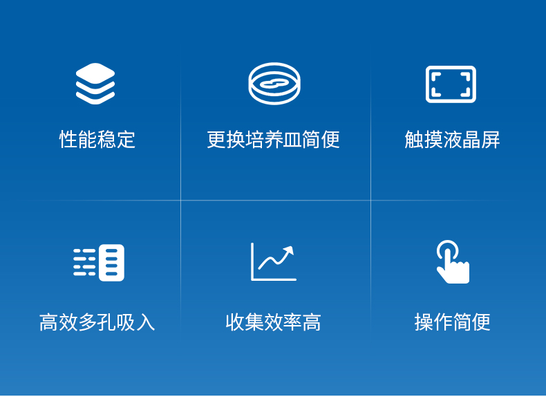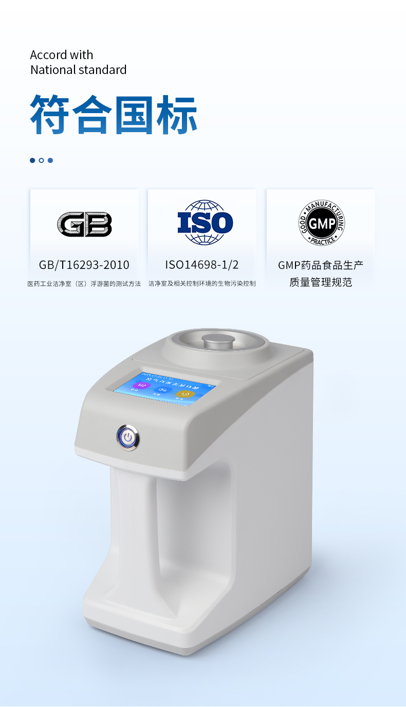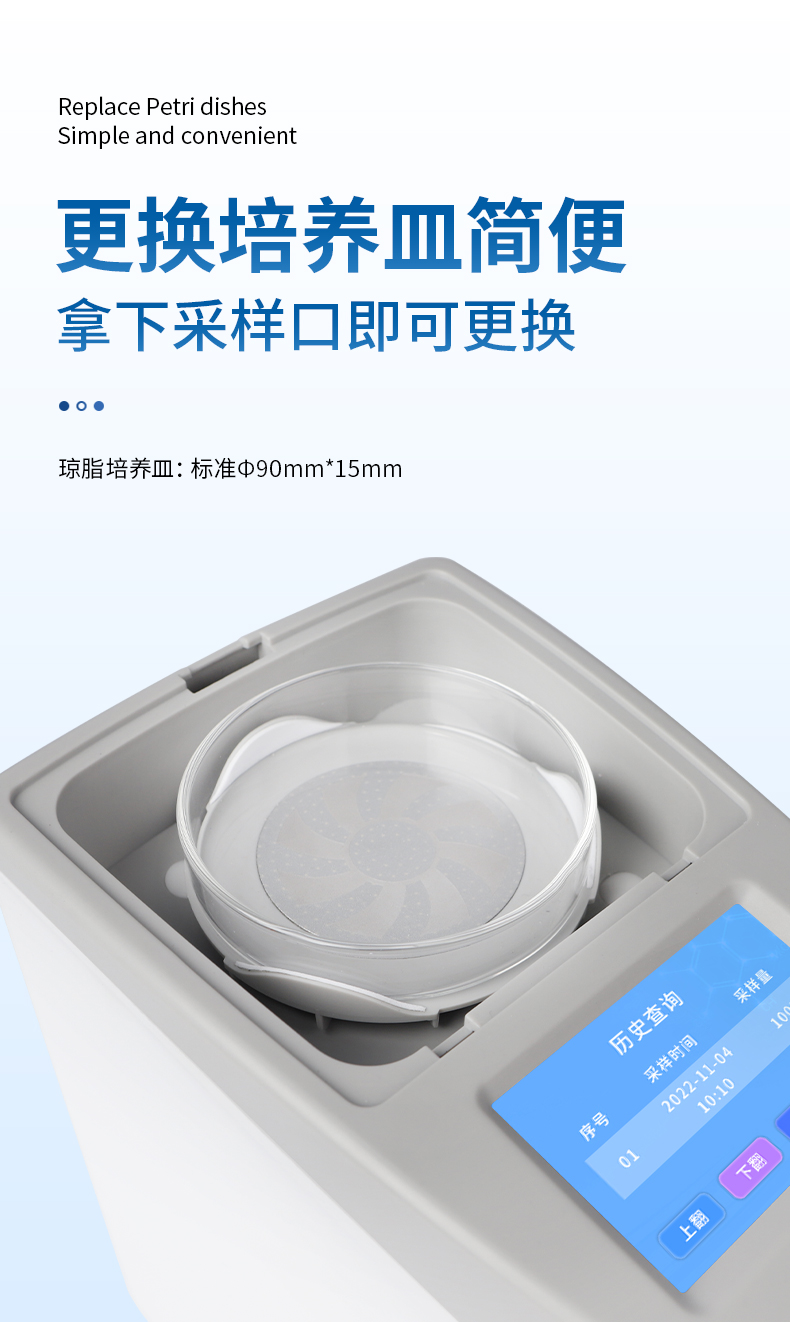 采樣時,帶塵菌空氣高速通過微孔,被撞擊在培養皿內的瓊脂表面;采集完成后把瓊脂培養皿蓋好,這些活體微生物在培養過程中,發生動能再水化過程,高速生長,從而更快得出結果。
