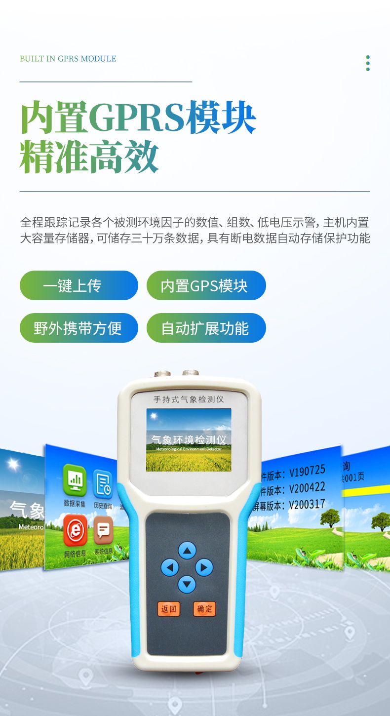 采用一體化結(jié)構(gòu)設(shè)計(jì),內(nèi)置GPS模塊,4G模塊,外置SD卡,能準(zhǔn)確的測量出被測地點(diǎn)的地理信息,界面除顯示所測環(huán)境參數(shù)、存儲(chǔ)數(shù)據(jù)外,還可顯示測點(diǎn)的經(jīng)緯度。通過內(nèi)置的GPRS一鍵上傳被測點(diǎn)的環(huán)境因子測量數(shù)據(jù)等。同時(shí)還可以通過外置SD卡直接把數(shù)據(jù)導(dǎo)出到電腦上。(可選)