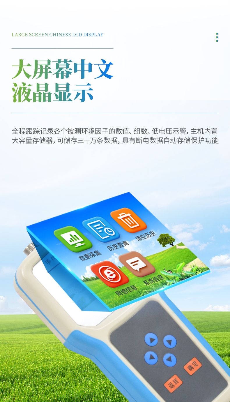大屏幕中文液晶顯示,全程跟蹤記錄各個(gè)被測環(huán)境因子的數(shù)值、組數(shù)、低電壓示警,主機(jī)內(nèi)置大容量存儲(chǔ)器,可儲(chǔ)存三十萬條數(shù)據(jù),具有斷電數(shù)據(jù)自動(dòng)存儲(chǔ)保護(hù)功能。