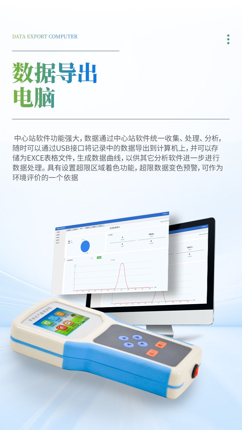 中心站軟件功能強(qiáng)大,數(shù)據(jù)通過中心站軟件統(tǒng)一收集、處理、分析,隨時(shí)可以通過USB接口將記錄中的數(shù)據(jù)導(dǎo)出到計(jì)算機(jī)上,并可以存儲(chǔ)為EXCE表格文件,生成數(shù)據(jù)曲線,以供其它分析軟件進(jìn)一步進(jìn)行數(shù)據(jù)處理。具有設(shè)置超限區(qū)域著色功能,超限數(shù)據(jù)變色預(yù)警,可作為環(huán)境評價(jià)的一個(gè)依據(jù)。