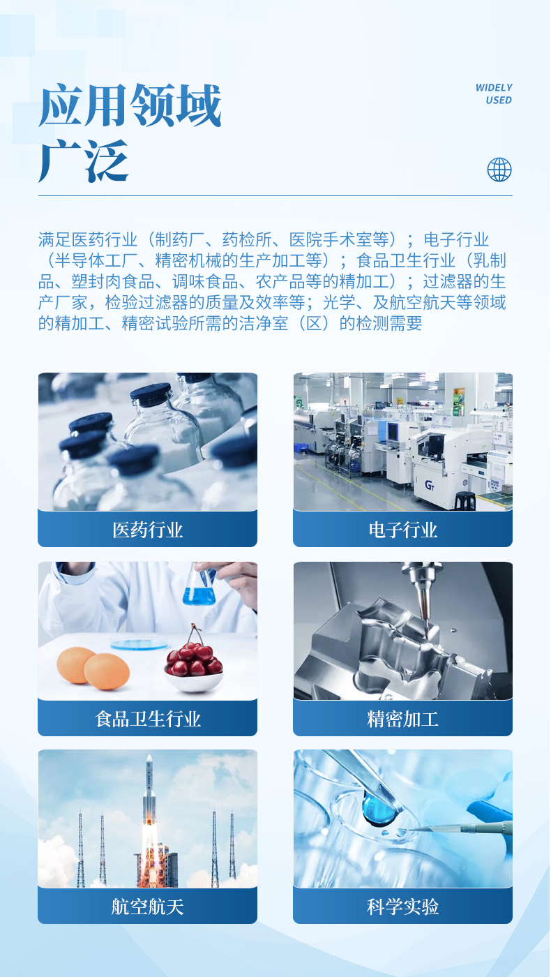 滿足醫藥行業(制藥廠、藥檢所、醫院手術室等);電子行業(半導體工廠、精密機械的生產加工等);食品衛生行業(乳制品、塑封肉食品、調味食品、農產品等的精加工);過濾器的生產廠家,檢驗過濾器的質量及效率等;光學、及航空航天等領域的精加工、精密試驗所需的潔凈室(區)的檢測需要。