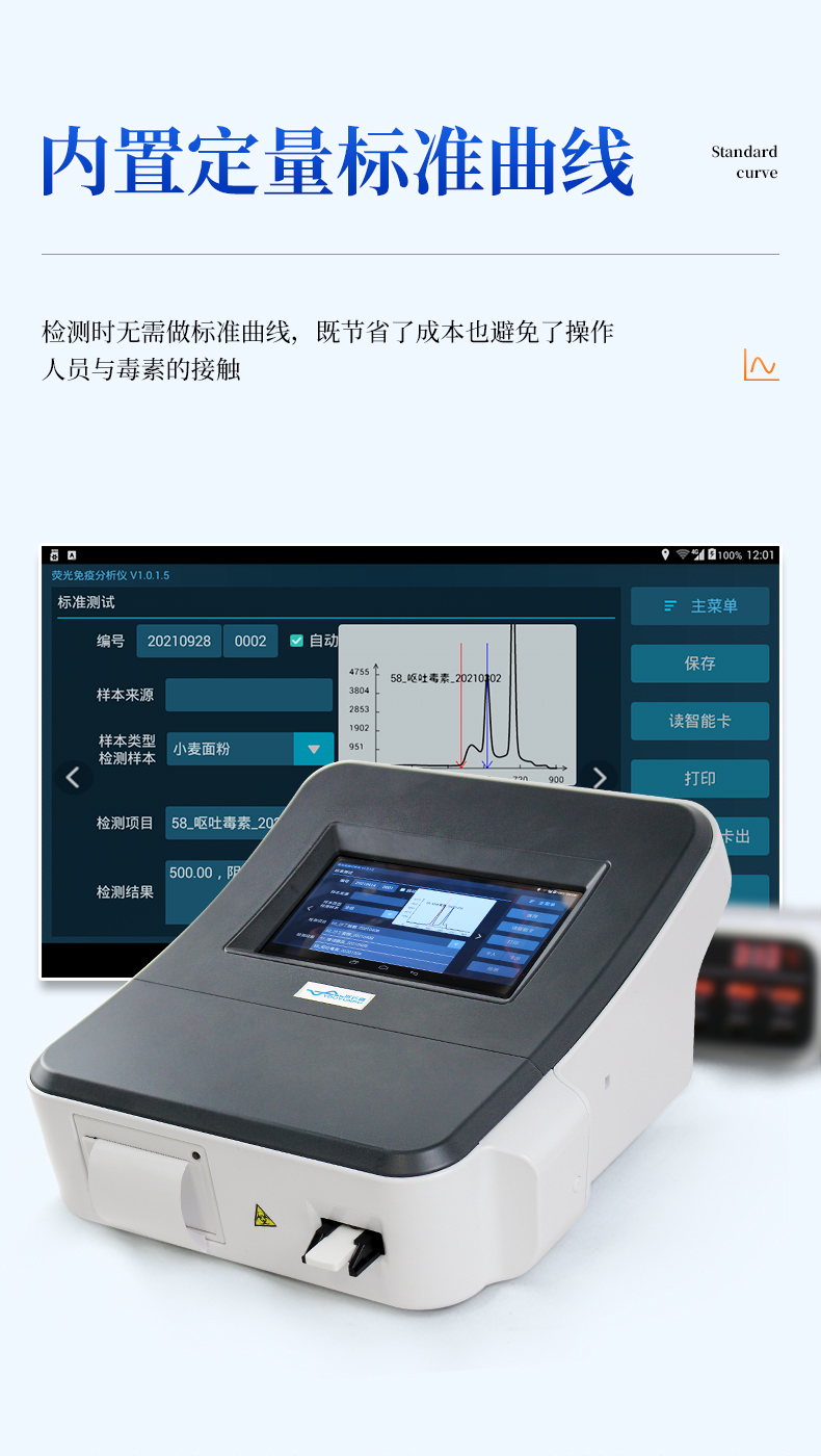 3、內(nèi)置定量標(biāo)準(zhǔn)曲線:儀器內(nèi)置標(biāo)準(zhǔn)曲線,無需使用標(biāo)準(zhǔn)品,檢測時無需做標(biāo)準(zhǔn)曲線,既節(jié)省了成本,也避免了操作人員與嘔吐毒素的接觸,保護(hù)操作人員的安全;