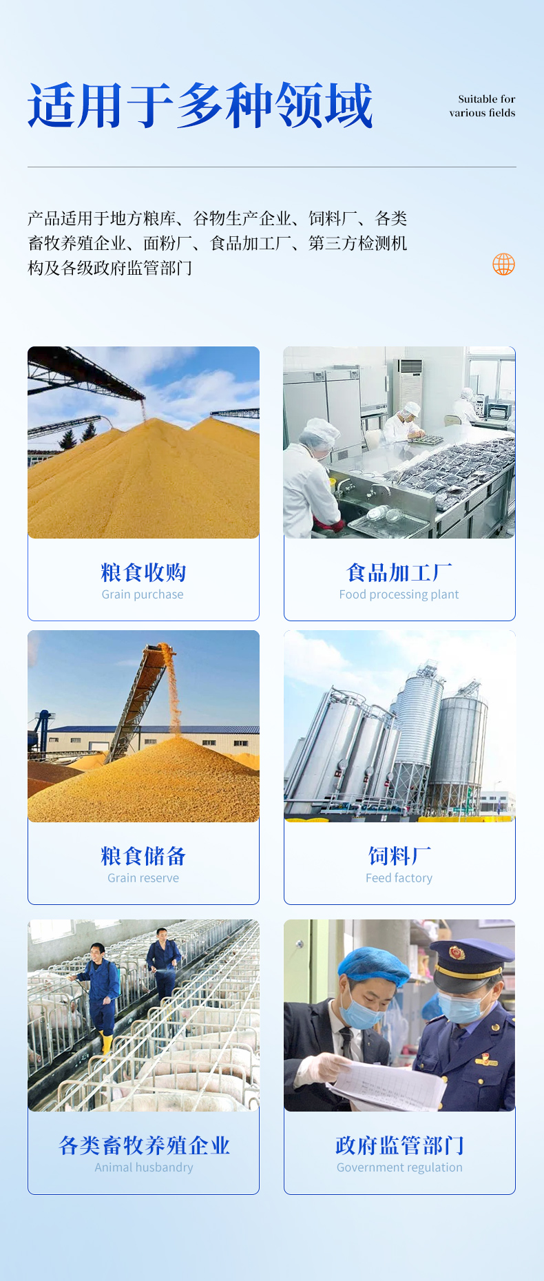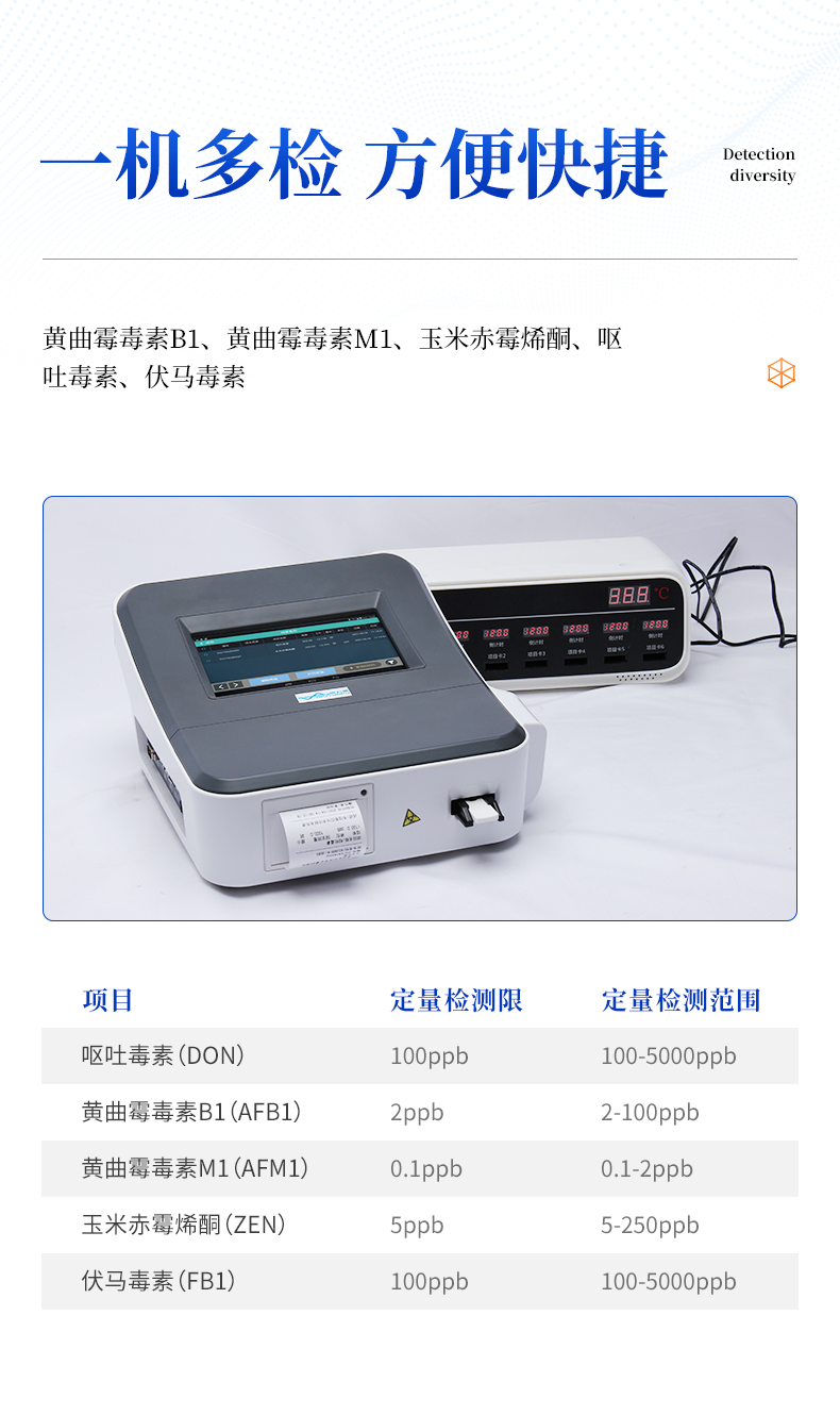 YP-L02型真菌毒素快速檢測儀采用熒光定量快速檢測原理,主要檢測糧油谷物飼料中真菌毒素含量,包括黃曲霉毒素B1、黃曲霉毒素M1、玉米赤霉烯酮、嘔吐毒素、伏馬毒素等等,檢測樣品涵蓋糧食谷物(大米、玉米、小麥、大麥、高粱等)及其制品、飼料及其原料、食用油脂、牛奶及其制品等;樣品前處理簡單,整個檢測過程檢測12min,產(chǎn)品適用于地方糧庫、谷物生產(chǎn)企業(yè)、飼料廠、各類畜牧養(yǎng)殖企業(yè)、面粉廠、食品加工廠、第三方檢測機構(gòu)及各級政府監(jiān)管部門。