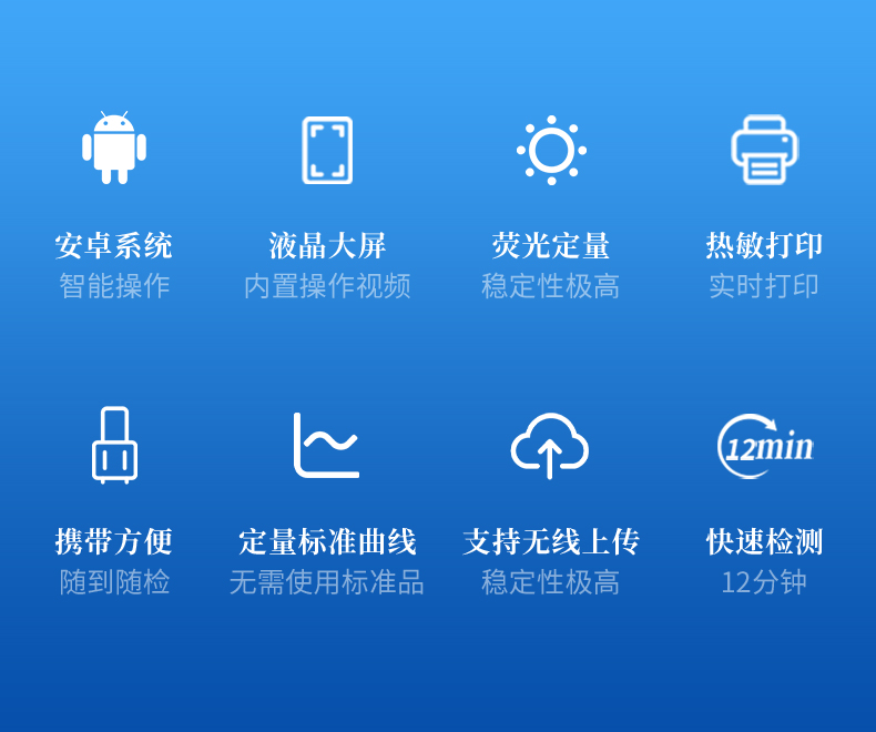 11、檢測判讀:儀器具有開機自檢功能,12S內(nèi)完成檢測卡判讀,單個樣本的檢測時間小于8S。