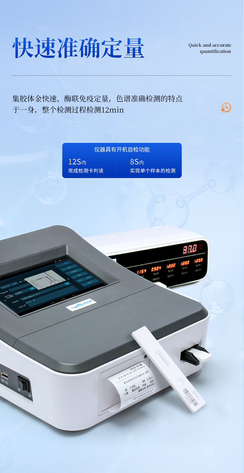 2、快速準(zhǔn)確定量:集膠體金快速,酶聯(lián)免疫定量、色譜準(zhǔn)確檢測的特點于一身,實現(xiàn)快速準(zhǔn)確定量檢測;