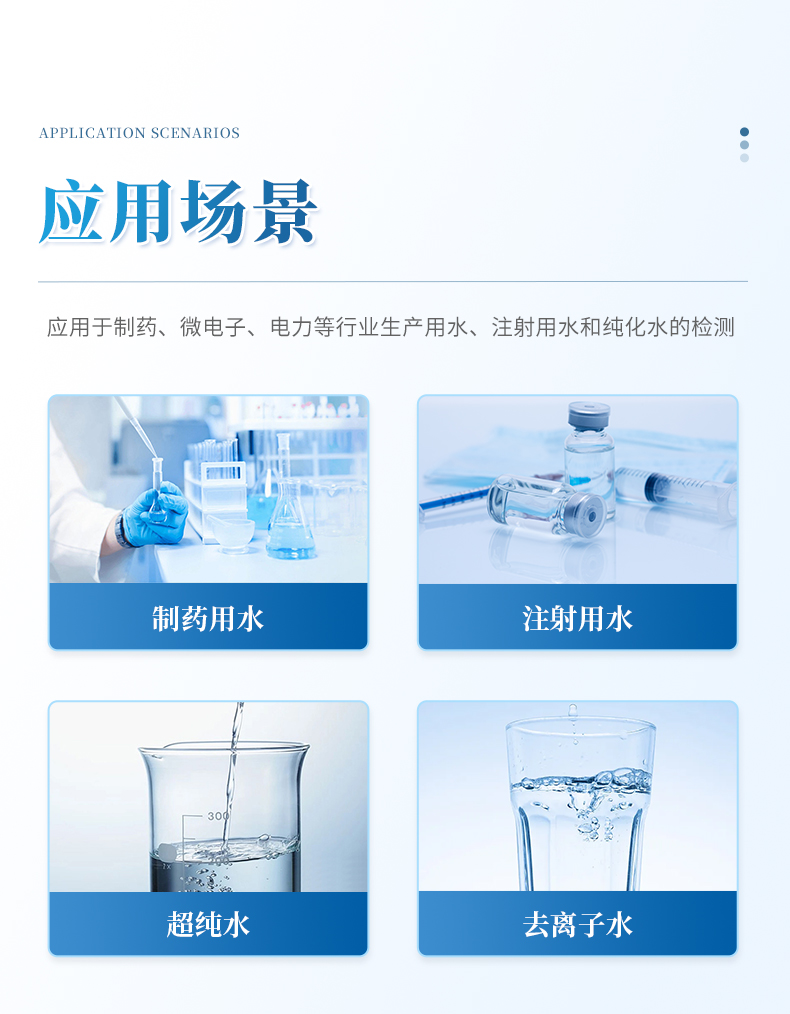產品具有檢測限低、靈敏度高、響應速度快及穩定性好等特點,操作界面簡潔,易于使用。可廣泛應用于制藥、微電子、電力等行業的生產用水、注射用水和純化水的檢測,是確保水質安全、滿足藥典及相關行業法規要求的可靠工具。