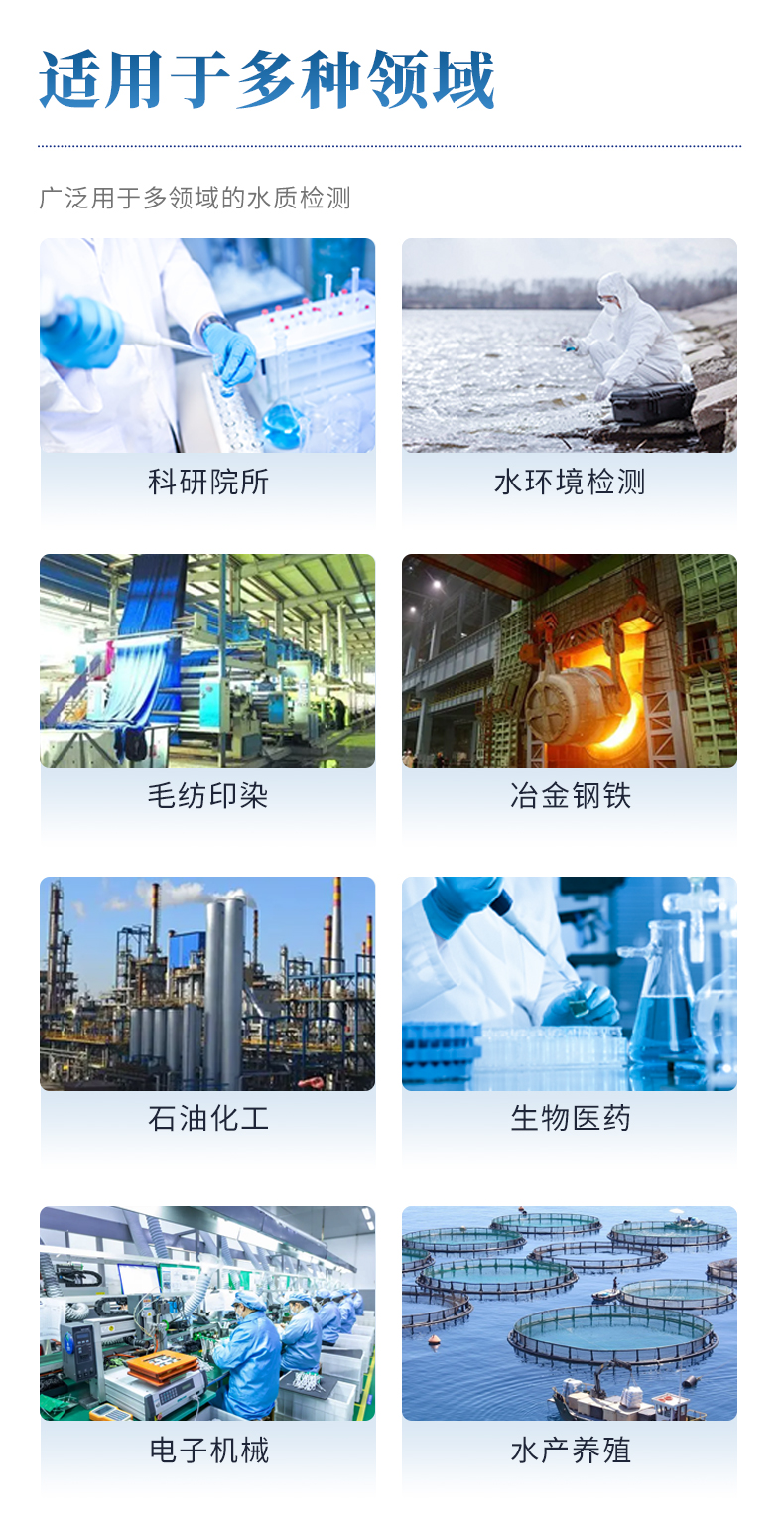 YP-X06型便攜式智能消解儀可廣泛應(yīng)用于科研院所、污水工程、水環(huán)境檢測(cè)、石油化工、冶金鋼鐵、生物醫(yī)藥、食品乳業(yè)、毛紡印染、電子機(jī)械、水產(chǎn)養(yǎng)殖、光伏、皮革、造紙等領(lǐng)域的水質(zhì)檢測(cè)。