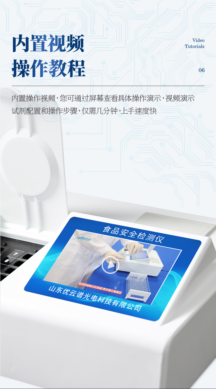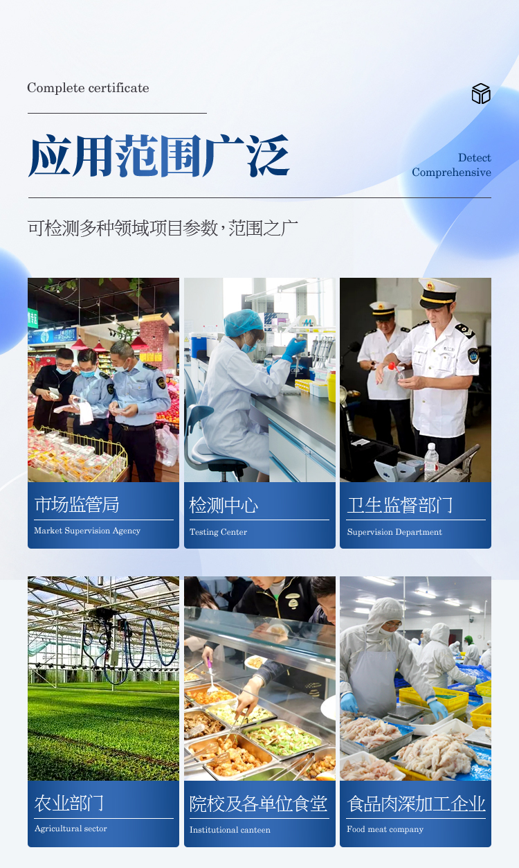 可快速檢測(cè)各類(lèi)食品中的甲醛、吊白塊、二氧化硫、亞硝酸鹽、雙氧水、硼砂、農(nóng)藥殘留、乳及乳制品中蛋白質(zhì)的含量,儀器預(yù)留其他項(xiàng)目檢測(cè)程序和端口,根據(jù)日后需求可方便的自主增加檢測(cè)項(xiàng)目。