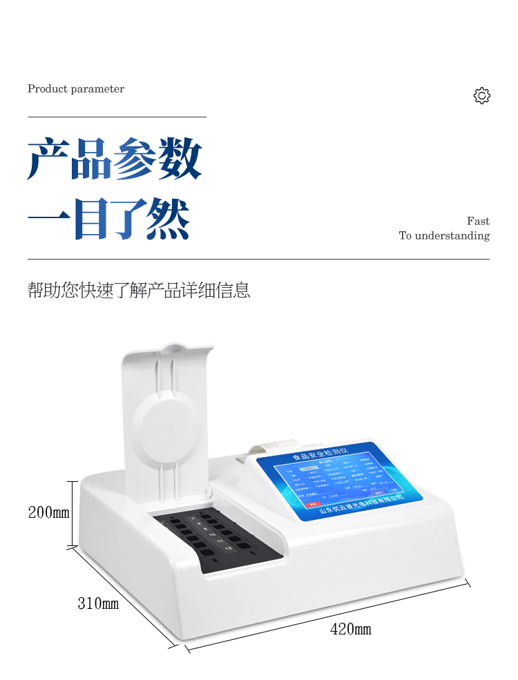 可快速檢測各類食品中的亞硝酸鹽、二氧化硫、甲醛、吊白塊、雙氧水、硼砂、農(nóng)藥殘留、乳及乳制品中蛋白質(zhì)、硝酸鹽、重金屬鉛的含量,儀器預(yù)留其他項(xiàng)目檢測程序和端口,根據(jù)日后需求可方便的自主增加檢測項(xiàng)目。