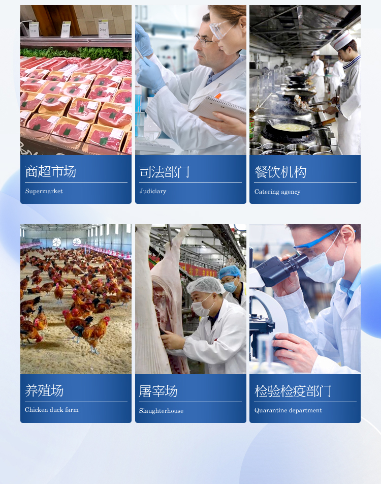 該多功能食品安全檢測(cè)儀為集成化食品安全快速檢測(cè)分析設(shè)備,廣泛應(yīng)用于食藥監(jiān)局、衛(wèi)生部門、高教院校、科研院所、農(nóng)業(yè)部門、養(yǎng)殖場(chǎng)、屠宰場(chǎng)、食品肉產(chǎn)品深加工企業(yè)、檢驗(yàn)檢疫部門等單位使用。