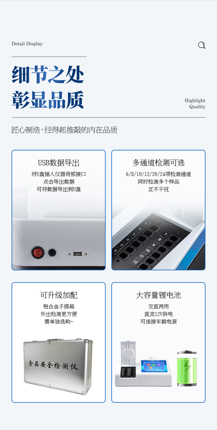 可快速檢測各類食品中的亞硝酸鹽、二氧化硫、甲醛、吊白塊、雙氧水、硼砂、農藥殘留、乳及乳制品中蛋白質、硝酸鹽、重金屬鉛的含量,儀器預留其他項目檢測程序和端口,根據日后需求可方便的自主增加檢測項目。