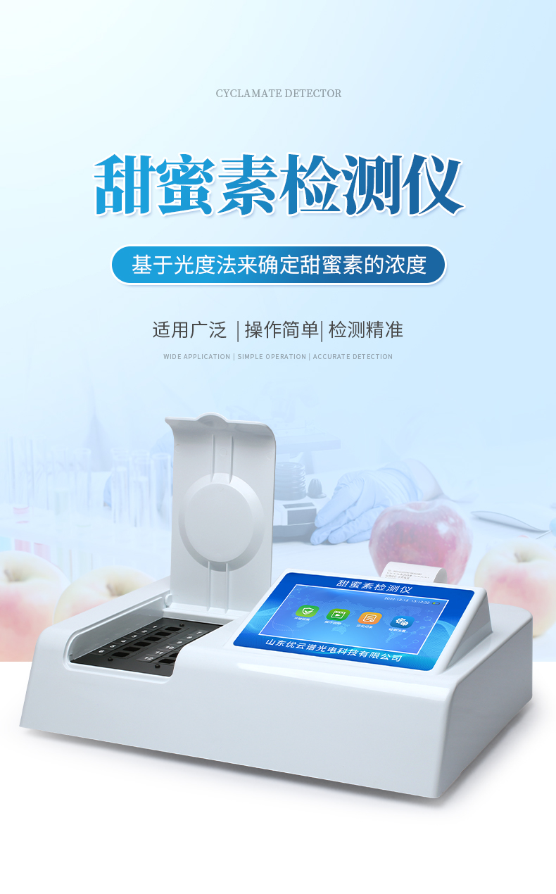 該檢測儀通過測量特定波長下溶液對光的吸收程度來確定甜蜜素的濃度。甜蜜素在水溶液中與特定試劑反應后,會形成一種在可見光或紫外光區域有明顯吸收峰的復合物。當用適當波長的光照射這種溶液時,根據朗伯-比爾定律(Lambert-Beer Law),吸光度與溶液中甜蜜素的濃度成正比關系。