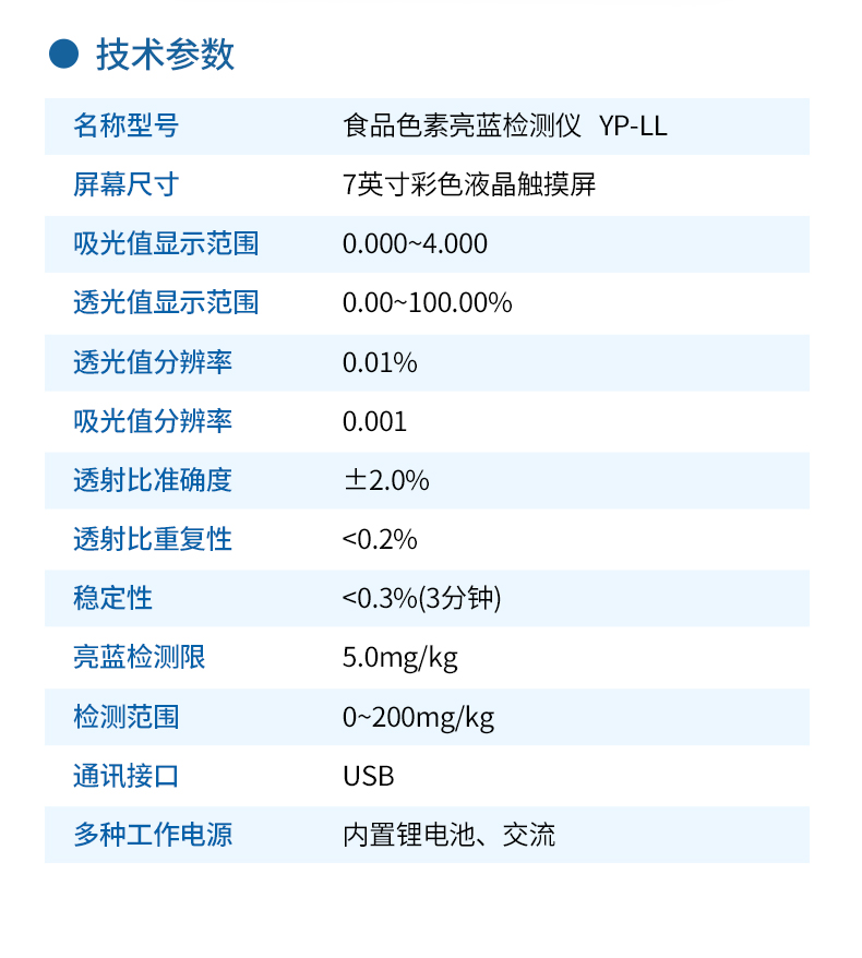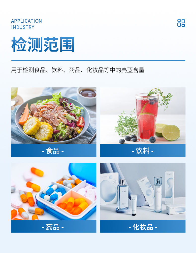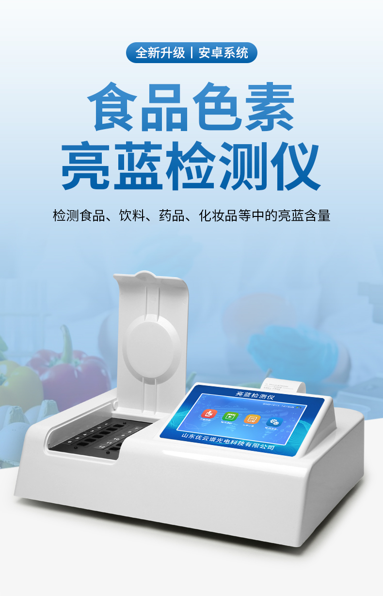 亮藍檢測儀,主要用于檢測食品、飲料、藥品、化妝品等中的亮藍含量,?具有操作簡單的特點。亮藍,又稱為誘惑藍,是一種常用的合成食品著色劑,廣泛應用于食品、飲料和藥品中。通過亮藍檢測儀的檢測結果,可以看出這些產(chǎn)品中的亮藍含量是否符合國家和國際標準,從而保障其安全性和合規(guī)性? 。