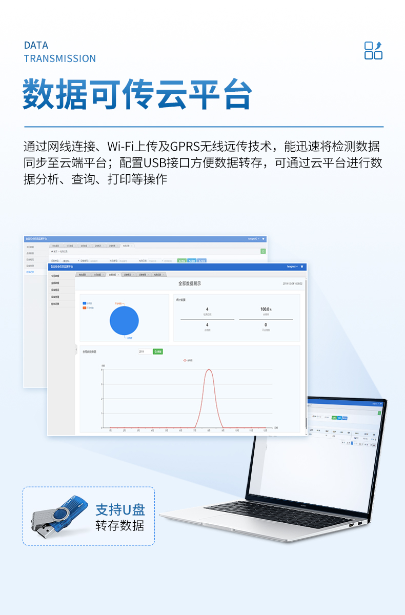 ●配置USB接口,支持U盤轉存,方便數(shù)據(jù)轉存至云平臺,通過平臺實現(xiàn)數(shù)據(jù)查詢、瀏覽、分析、統(tǒng)計、打印等。
