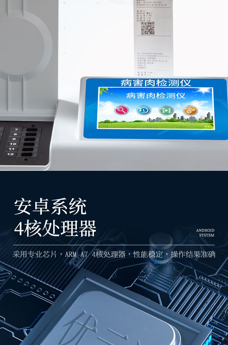 可快速檢測病害肉、組胺、揮發(fā)性鹽基氮,儀器預(yù)留其他項目檢測程序和端口,根據(jù)日后需求可方便的自主增加檢測項目。
