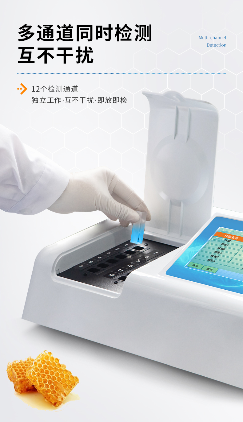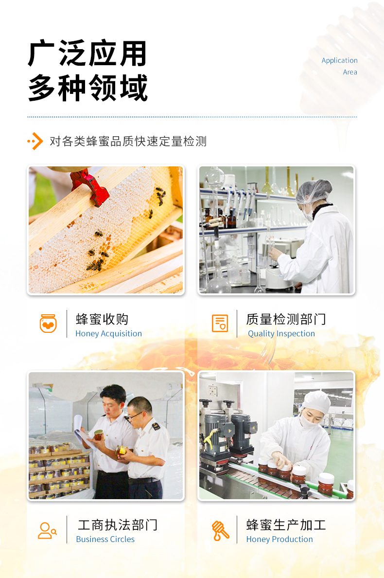 檢測項目:蜂蜜蔗糖、蜂蜜還原糖(葡萄糖和果糖)、蜂蜜羥甲基糠醛、蜂蜜酸度、蜂蜜中農藥殘留、蜂蜜淀粉酶值、蜂蜜中脯氨酸、蜂蜜水分、蜂蜜糖分、蜂蜜中重金屬(鉛、鎘、汞)、蜂蜜中抗生素(氯霉素、四環素、磺胺類、呋喃類、喹諾酮類)、蜂蜜中灰分,應用范圍:應用于現場檢測蜂蜜蔗糖、葡萄糖和果糖、羥甲基糠醛、酸度、農殘、淀粉酶、脯氨酸、水分、糖分、重金屬、抗生素、灰分含量的蜂蜜快速檢測儀,可廣泛應用于各類蜂蜜品質的快速定量檢測。
