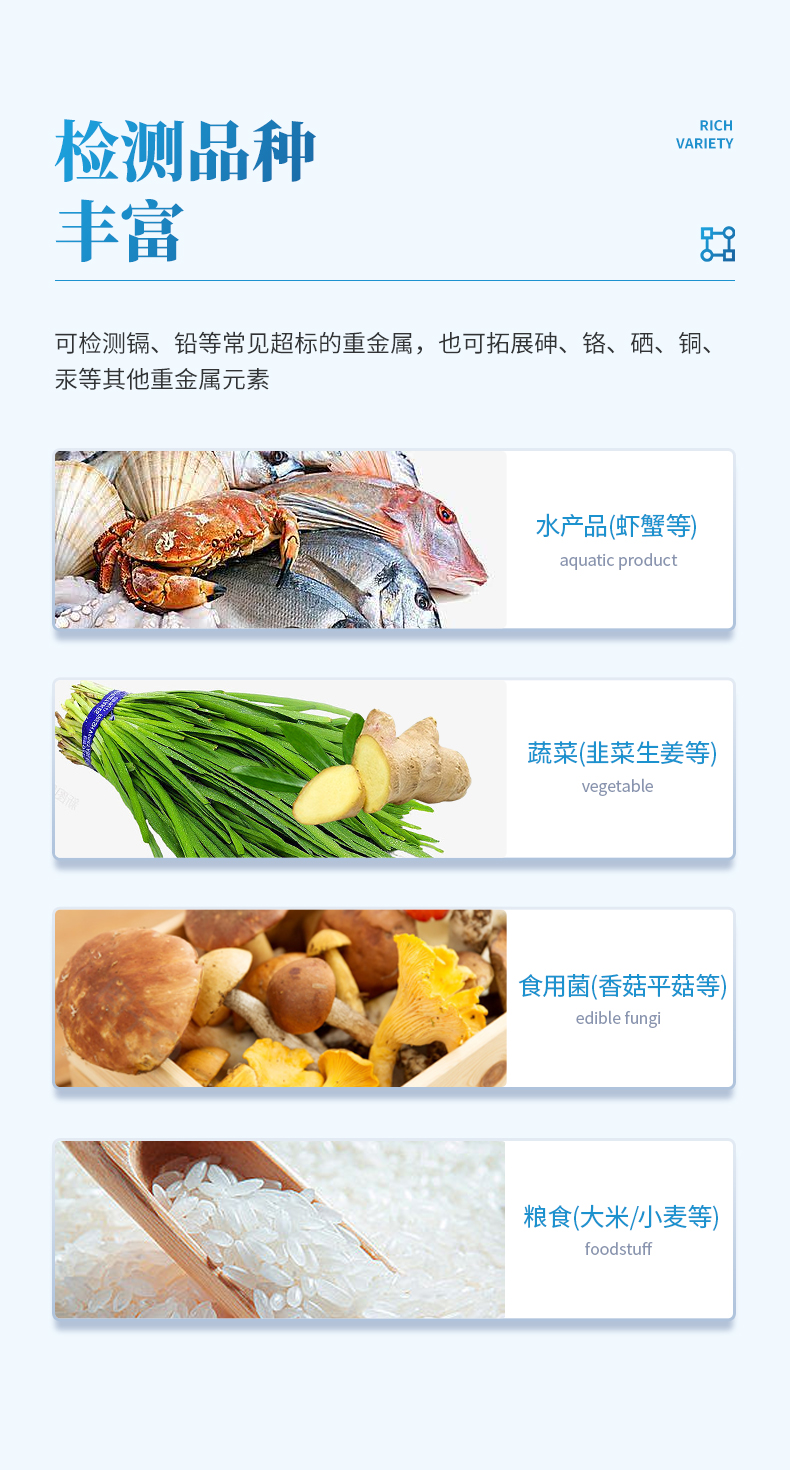 | 適用場景 | 糧油、水質、食品農產品中重金屬檢測 |