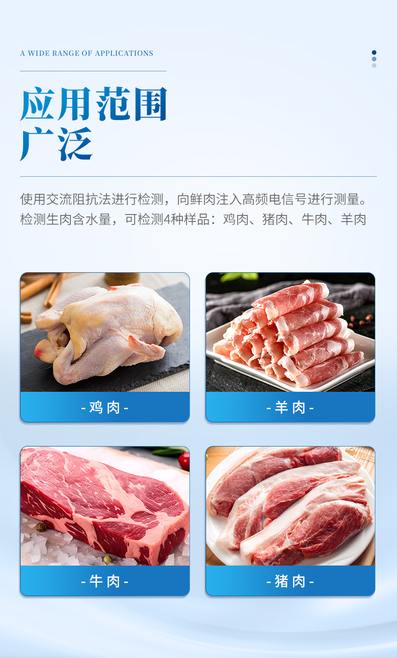 檢測(cè)生肉含水量,可檢測(cè)4種樣品:雞肉、豬肉、牛肉、羊肉。