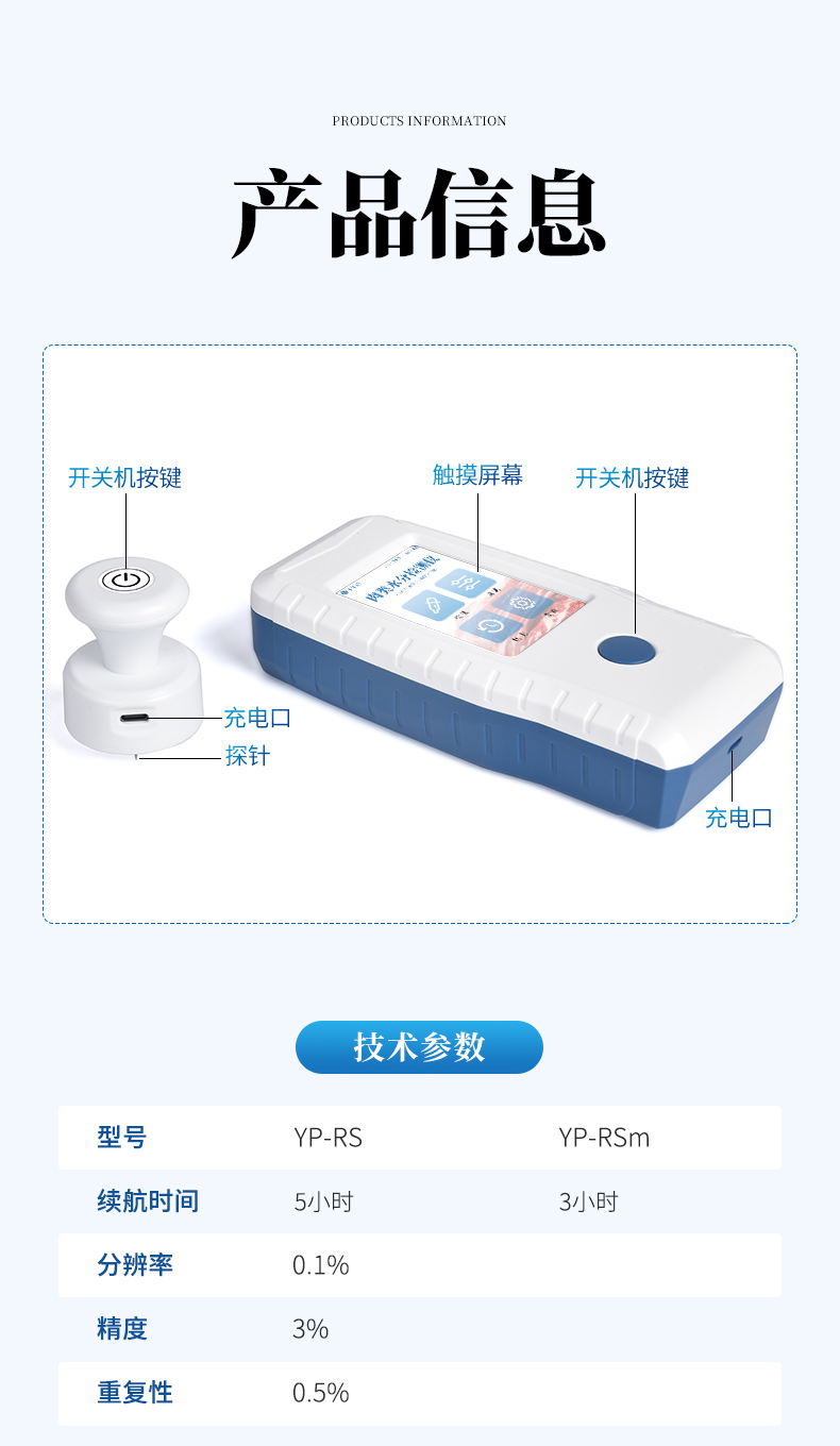 4. 不連接充電器的續(xù)航時(shí)間:探頭3小時(shí),手持機(jī)5小時(shí)。