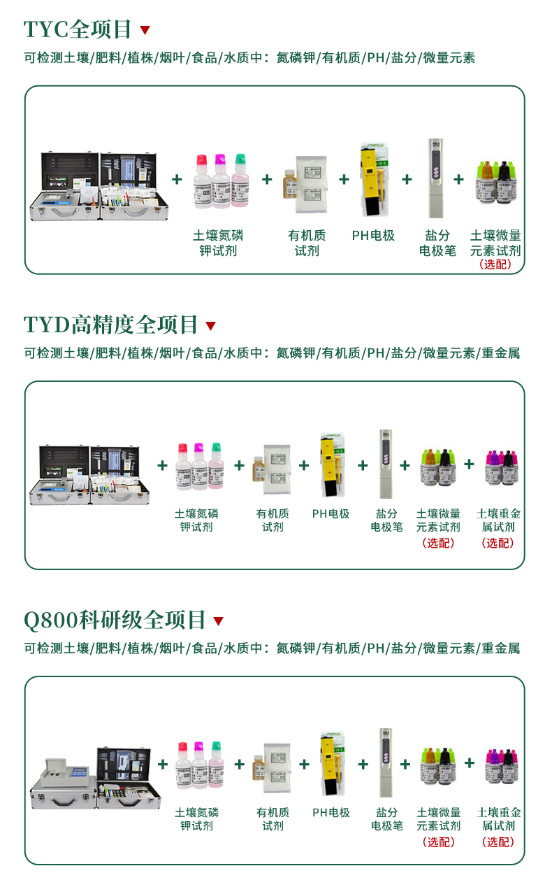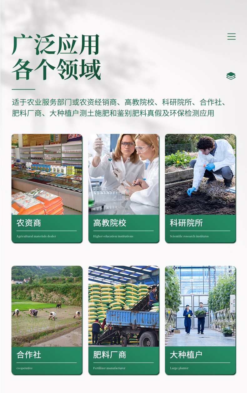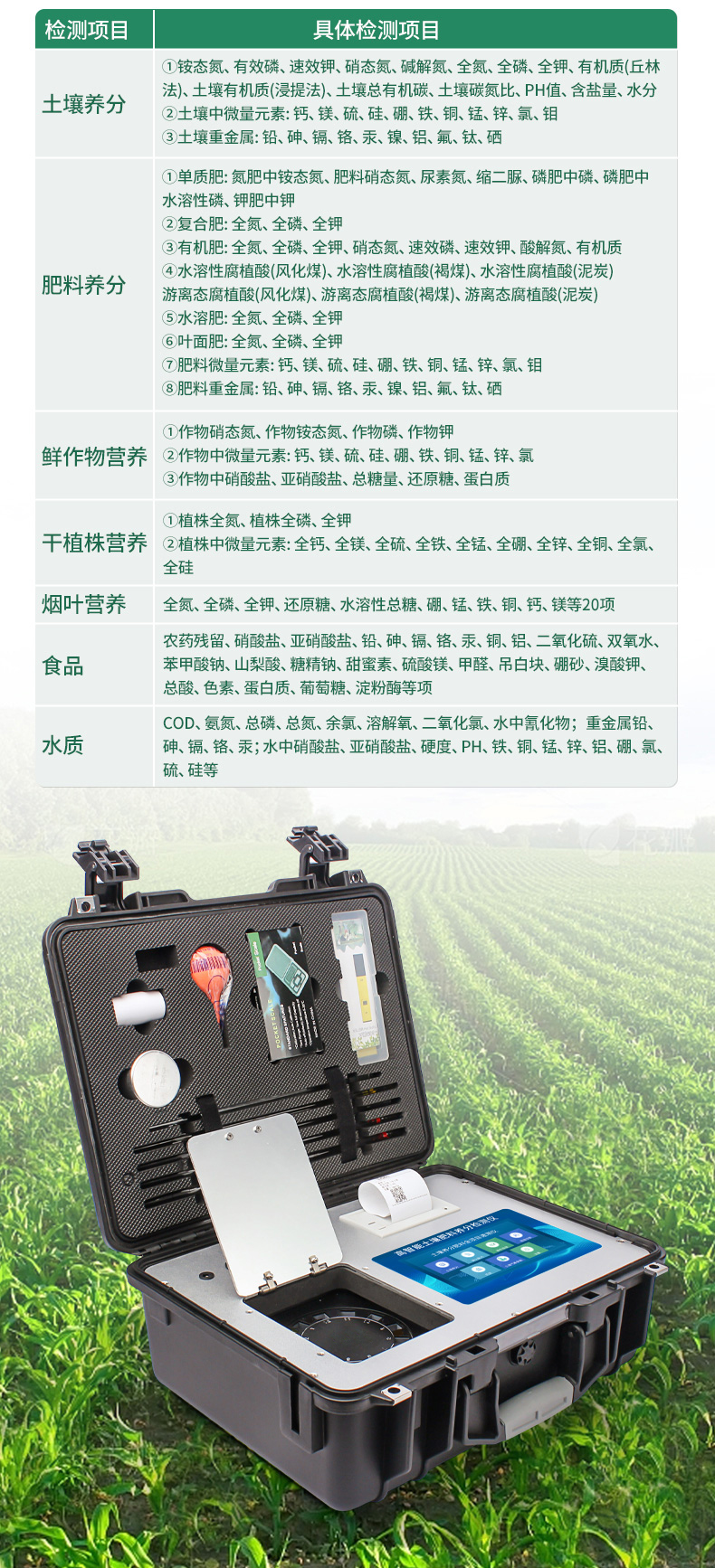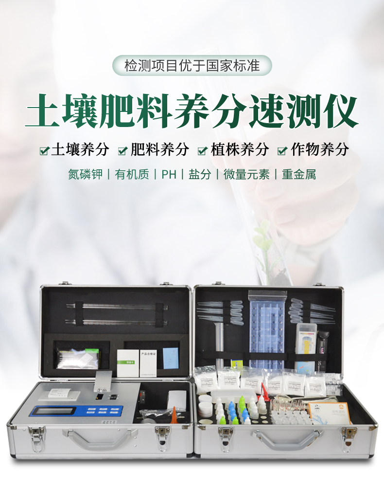 配套齊全:該儀器集藥、器、儀為一體,攜帶方便,相當于一個小型實驗室。適于農業服務部門或農資經銷商、肥料廠商測土施肥和鑒別肥料真假。