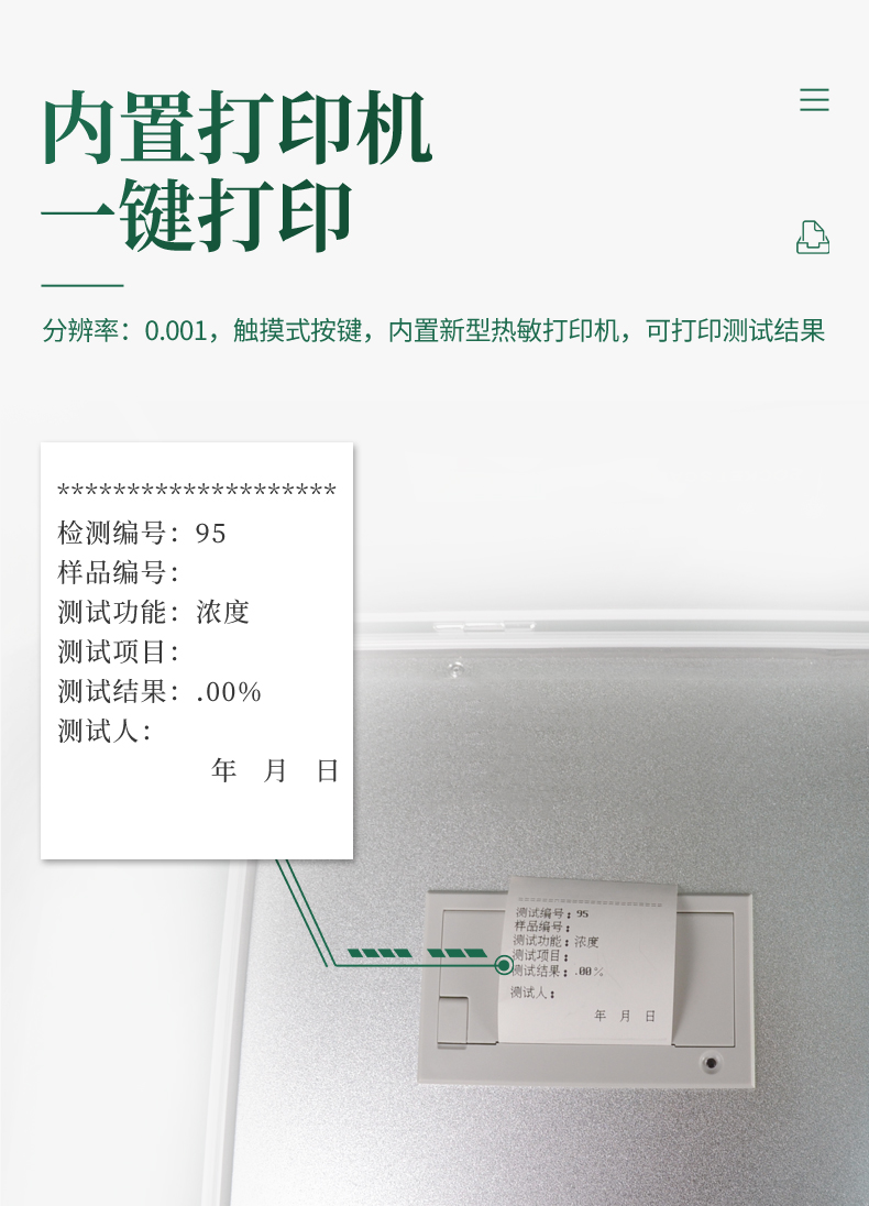 3、分辨率:0.001,觸摸式按鍵,內置高效熱敏打印機,可打印測試結果。