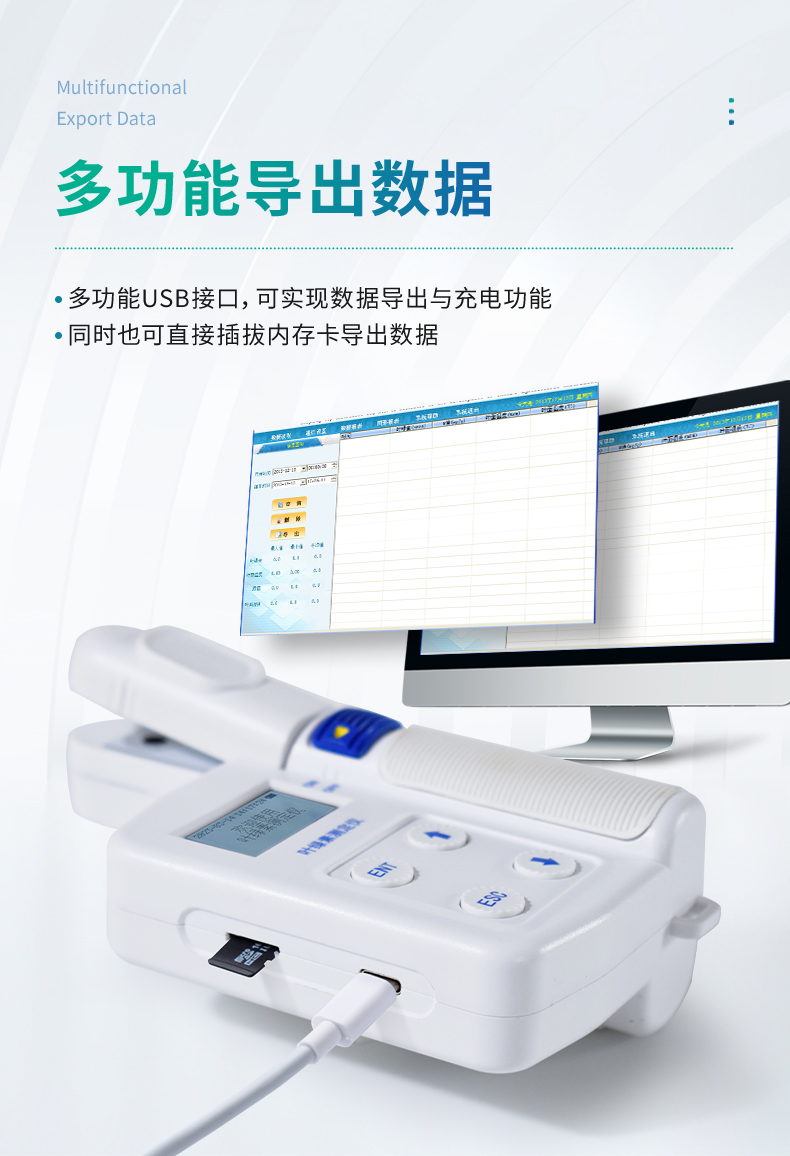 5.多功能USB接口,可實現數據導出與充電功能,可將儀器與電腦直接聯機,數據導出無需上位機軟件,還可選擇使用內存卡直接導出數據,操作簡單方便