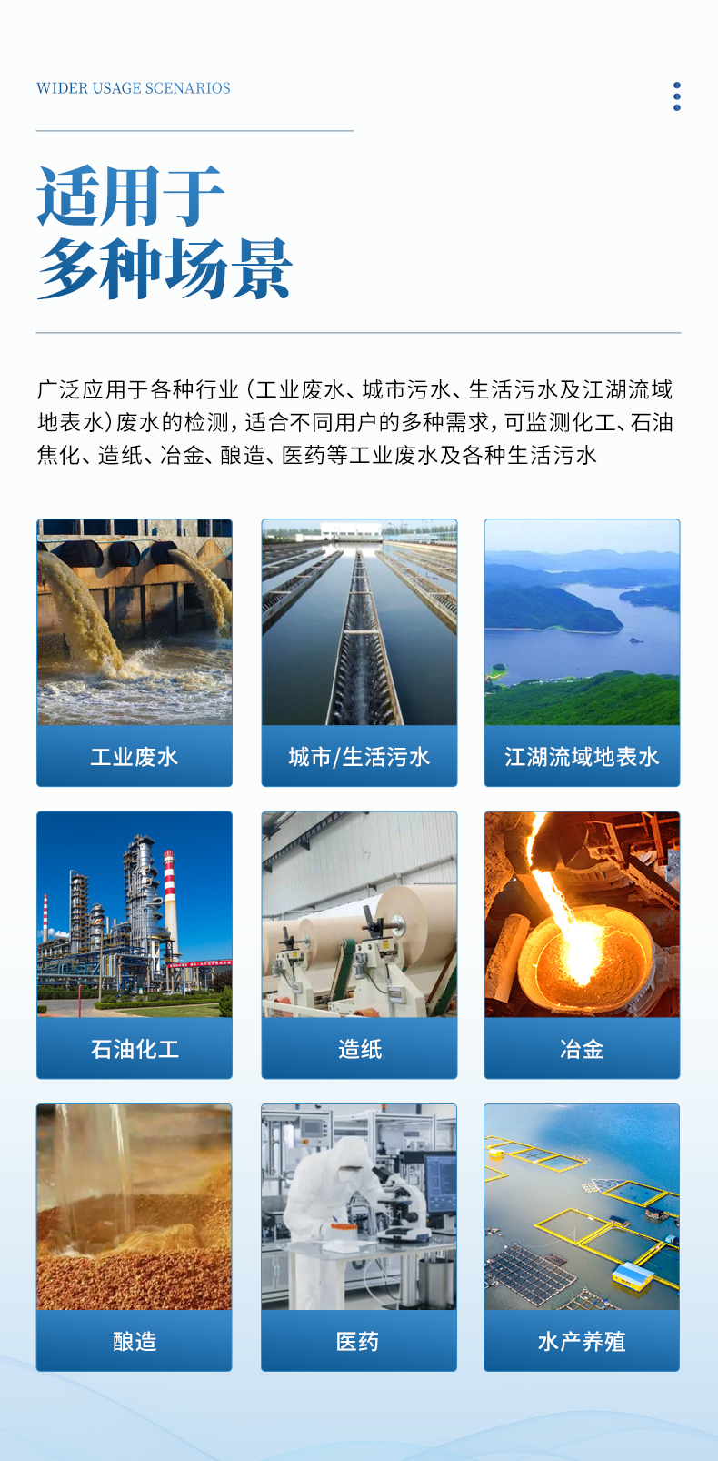 能夠廣泛的應(yīng)用于各種行業(yè)(工業(yè)廢水、城市污水、生活污水及江湖流域地表水)廢水的檢測,可適合不同用戶的多種需求,可在化工、石油、焦化、造紙、冶金、釀造、醫(yī)藥等工業(yè)廢水及各種生活污水監(jiān)測應(yīng)用。